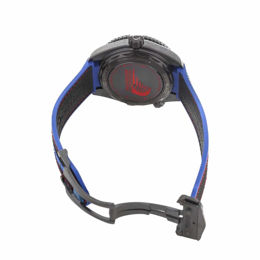 certification limits, and the second hand has a sweep motion. The case is made of ceramic and is black in color, with a ceramic